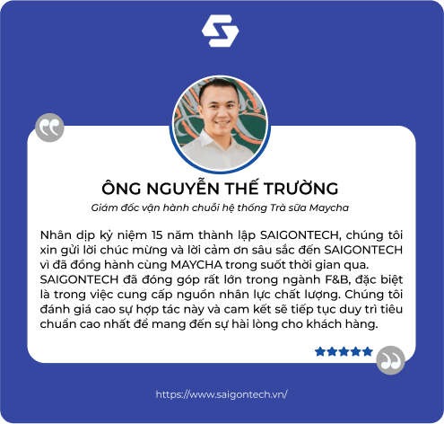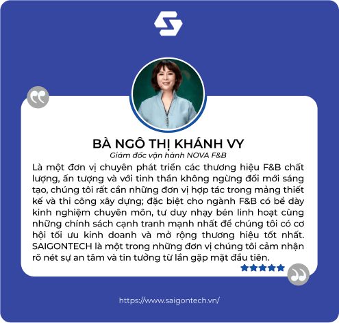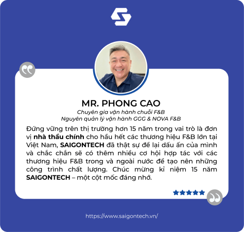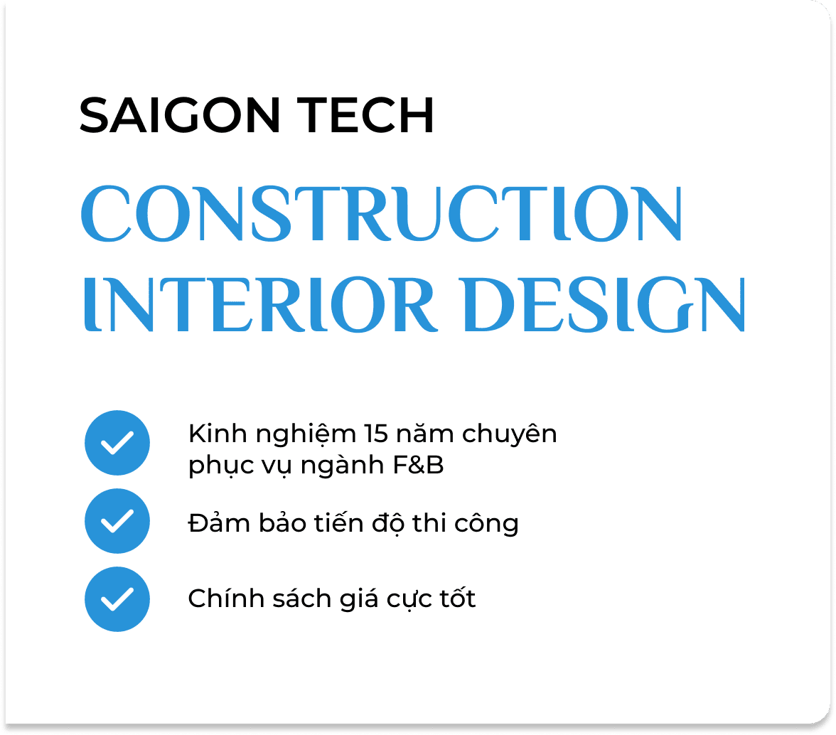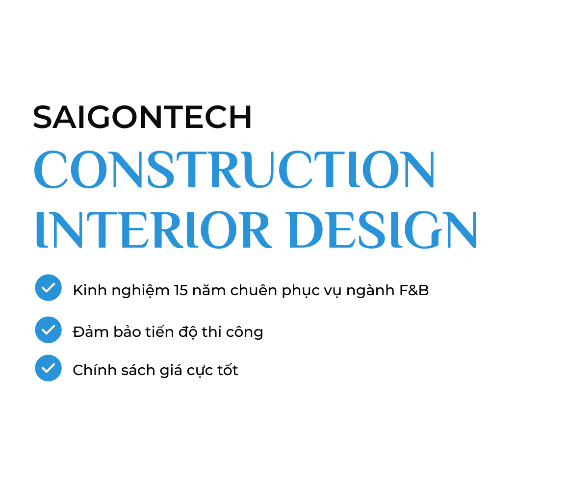 Saigontech có hơn 15 năm kinh nghiệm là NHÀ THẦU CHÍNH uy tín và chuyên nghiệp trong thiết kế & thi công các dự án thương mại dịch vụ, đặc biệt là lĩnh vực F&B với quy mô đầu tư đa dạng từ thấp đến cao và mô hình hoạt động linh hoạt từ các dự án nhỏ lẻ đến dự án chuỗi trên cả nước. Với bề dày kinh nghiệm, cùng quy trình tư vấn và giám sát bài bản, chúng tôi cam kết mang đến cho quý khách hàng những sản phẩm và dịch vụ chuyên nghiệp, chất lượng, cũng như đảm bảo tiến độ tốt nhất.